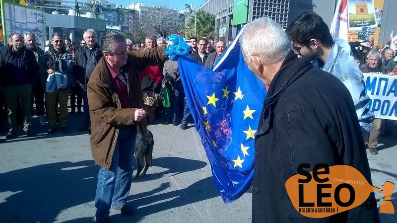 την αντίθεσή τους στα νέα μέτρα. Ως ένδειξη διαμαρτυρίας για τη σκληρή πολιτική της κυβέρνησης και της Ευρώπης, οι αγρότες έκαψαν μία σημαία της Ευρωπαϊκής Ένωσης.