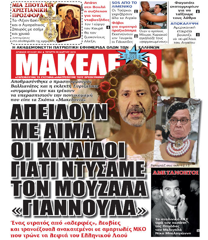 Απειλούν με αίμα οι κίναιδοι γιατί ντύσαμε τον Μουζάλα, “Γιαννούλα”. Αποθρασύνθηκε ο πρασινοφρουρός Βαλλιανάτος, λεσβίες, αδερφές και παλληκάρια, βουτηγμένοι στο δημόσιο χρήμα των αμαρτωλών ΜΚΟ. Προσοχή στα μπικουτί